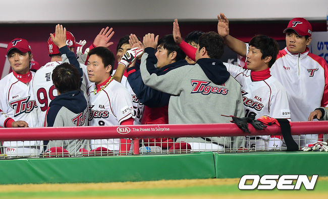 8회말 2사에서 KIA 필이 좌월 솔로홈런을 치고 더그아웃에서 동료들과 하이파이브를 하고 있다.