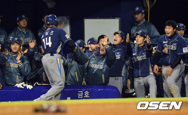 11일 오후 서울 잠실구장에서 열린 '2014 한국야쿠르트 세븐 프로야구' LG 트윈스와 NC 다이노스의 경기 7회초 2사 1,2루 김태군의 1타점 적시타에 홈을 밟은 테임즈가 덕아웃에서 동료들과 하이파이브를 하고 있다.