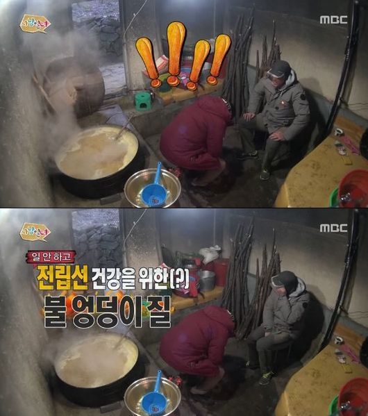 이날 김구라는 옥수수 엿을 만들던 도중 갑자기 아궁이 불에 엉덩이를 댔다. 김구라는 이를 지켜보던 서장훈에게 "이렇게 하면 전립선에 좋다"고 말했다.