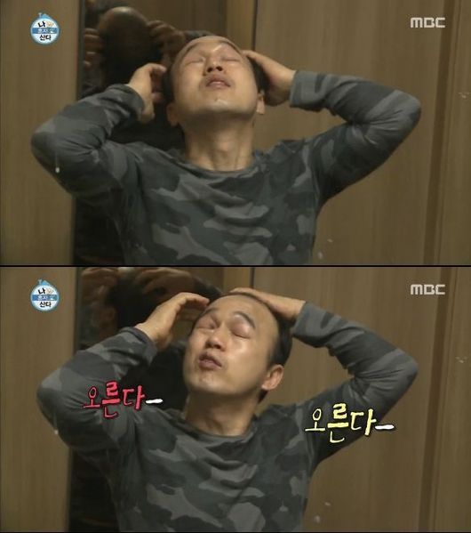 그는 머리에 발모제를 바른 뒤 "오른다 오른다"라고 주문을 걸어 더욱 폭소케 만들었다.