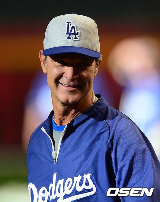 경기에 앞서 다저스 매팅리 감독이 훈련을 지도하며 미소짓고 있다.