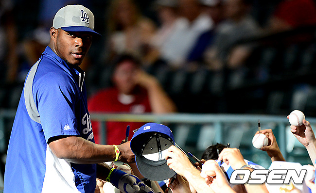 경기에 앞서 다저스 푸이그가 팬들에 사인을 해주고 있다.