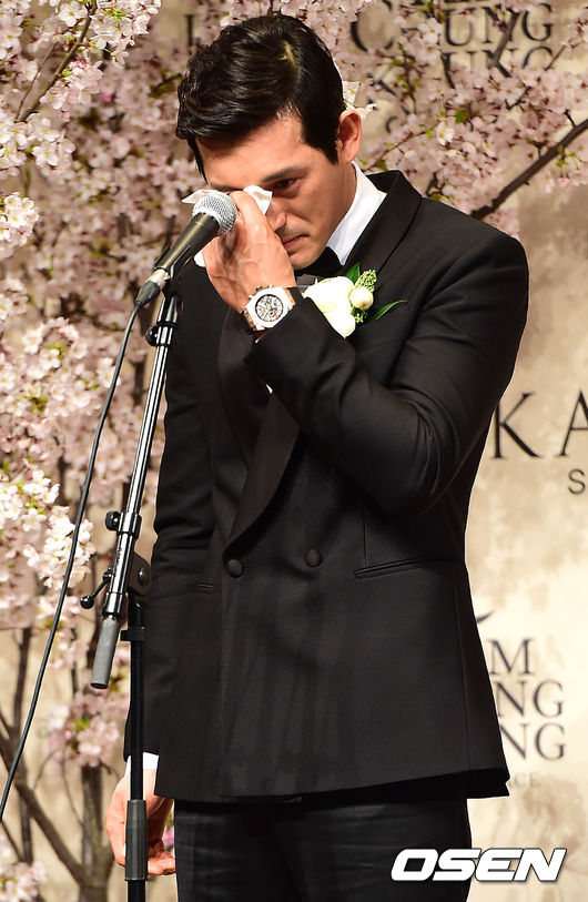 배우 오지호가 12일 오전 서울 장충동 신라호텔에서 결혼식을 앞두고 진행된 기자회견에 참석해 취재진의 질문에 답하던 중 눈물을 글썽이고 있다.