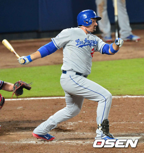 아드리안 곤살레스가 류현진의 어깨를 가볍게 하고 있다. 경기 초반 홈런 포함 4타점을 쓸어 담고 있다.