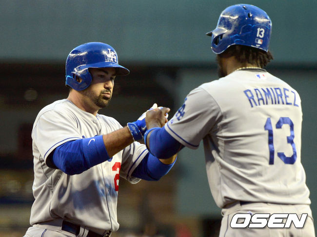 12일(이하 한국시간) 미국 애리조나주 피닉스 체이스필드에서 열린 '2014 메이저리그' LA 다저스와 애리조나 다이아몬드백스의 경기 1회초 곤잘레스가 투런 홈런을 치고 라미레스의 환영을 받고 있다.