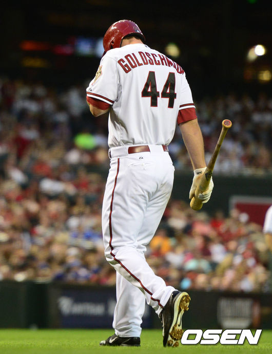 12일(이하 한국시간) 미국 애리조나주 피닉스 체이스필드에서 열린 '2014 메이저리그' LA 다저스와 애리조나 다이아몬드백스의 경기 1회말 류현진에 삼진 당한 골드슈미트가 고개를 숙이고 더그아웃으로 가고 있다.