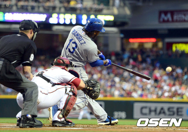 12일(이하 한국시간) 미국 애리조나주 피닉스 체이스필드에서 열린 '2014 메이저리그' LA 다저스와 애리조나 다이아몬드백스의 경기 1회초 라미레즈 팀의 첫 안타를 치고 있다.