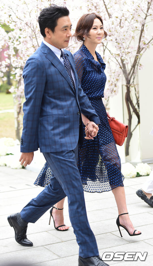배우 김승우와 김남주가 12일 오전 서울 장충동 신라호텔에서 열리는 '오지호 결혼식'에 참석해 포토타임을 마치고 퇴장하고 있다.