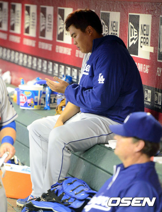 12일(이하 한국시간) 미국 애리조나주 피닉스 체이스필드에서 열린 '2014 메이저리그' LA 다저스와 애리조나 다이아몬드백스의 경기 수비를 마친 류현진이 더그아웃에서 손가락을 보고 있다.