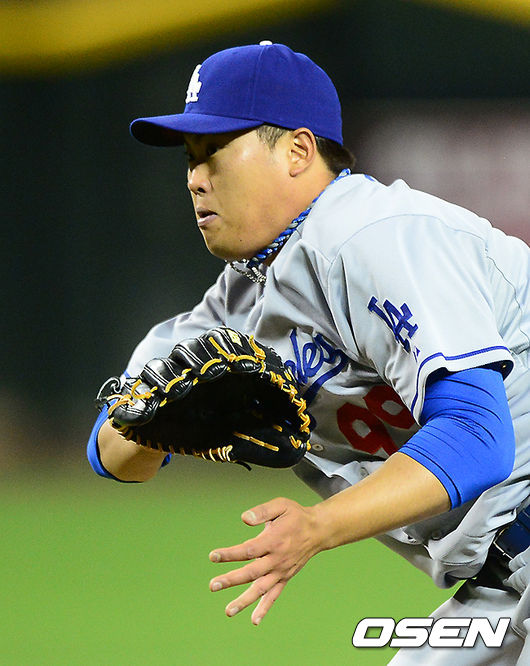 7회말 무사에서 다저스 류현진이 애리조나 프라도의 투수앞 땅볼에 본능적으로 글러브를 내밀며 잡아내고 있다. / jpnews@osen.co.kr