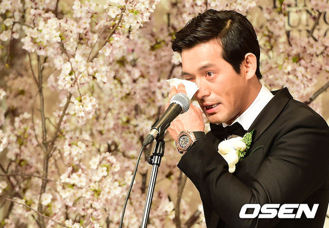 배우 오지호가 12일 오전 서울 장충동 신라호텔에서 결혼식을 앞두고 진행된 기자회견에 참석해 취재진의 질의응답에 답하던 중 눈물을 글썽이고 있다.