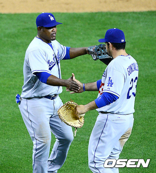 경기후 다저스 유리베와 곤잘레스가 하이파이브를 하고 있다../jpnews@osen.co.kr