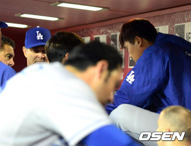 7회초 타격을 마친 류현진이 더그아웃에서 매팅리 감독과 이야기를 나누고 있다./jpnews@osen.co.kr