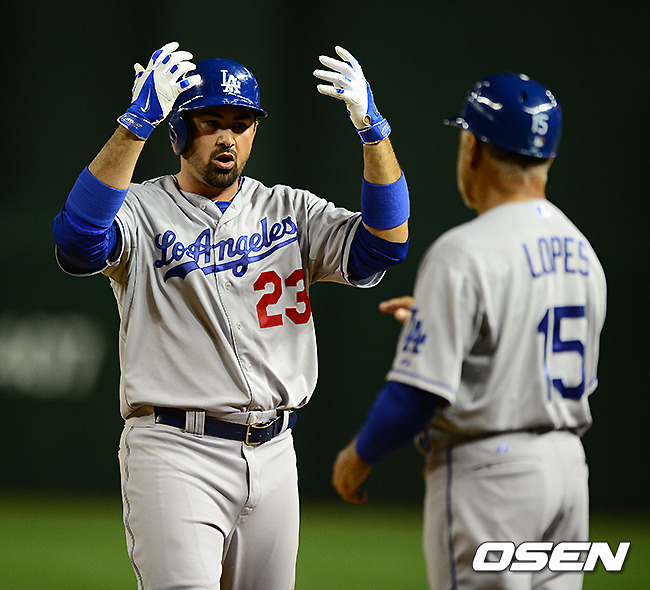 8회초 무사 2루에서 다저스 곤잘레스가 1타점 적시타를 날리고 기뻐하고 있다./jpnews@osen.co.kr
