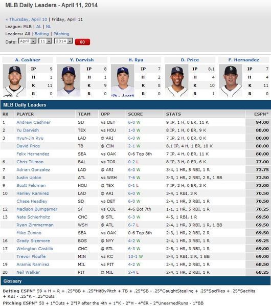 한편 2위는 일본인 투수 다르빗슈. 다르빗슈는 휴스턴전에서 8이닝 1피안타 9탈삼진 무실점을 기록했다. 다르빗슈는 빅리그 통산 가장 빠른 기간에 500탈삼진을 기록했다. 이날 6회까지 6탈삼진 퍼펙트 투구를 했지만 6회 선두 타자에게 안타를 내주고 페펙트가 깨졌다. 하지만 충분히 위력을 떨치며 88.00점을 받았다.