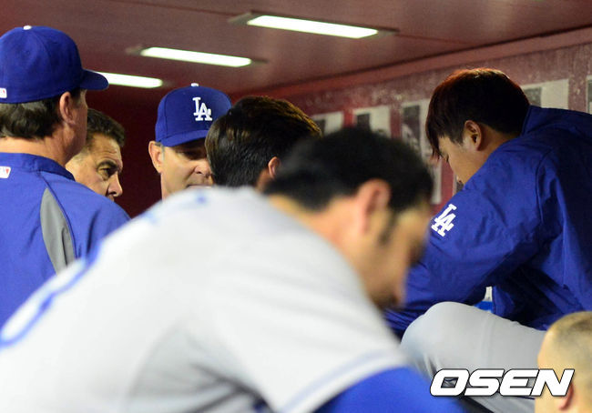 7회말 수비를 마친 류현진에게 매팅리 감독과 코칭스태프가 모여 이야기를 나누고 있다./jpnews@osen.co.kr