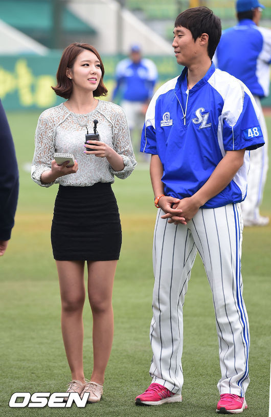 12일 오후 대구구장에서 열린 '2014 한국야쿠르트 세븐 프로야구' 삼성 라이온스와 SK 와이번스의 경기에 앞서 삼성 이흥련이 연상은 아나운서와 인터뷰를 하며 미소 짓고 있다.