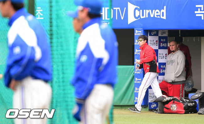 12일 오후 대구구장에서 열린 '2014 한국야쿠르트 세븐 프로야구' 삼성 라이온스와 SK 와이번스의 경기에 앞서 SK 선발투수 레이예스가 삼성 선수들의 훈련을 지켜보고 있다.
