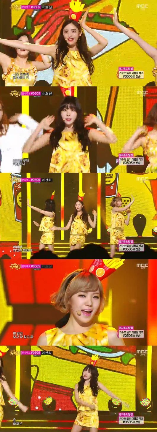 이날 오렌지캬라멜은 패스트푸드 콘셉트로 무대에 올랐다. 의상에는 감자튀김 사진이 프린트돼 있어 자체로 감자튀김 같았고 패스트푸드점의 감자튀김을 담은 봉투를 머리띠에 붙여 눈길을 끌었다.