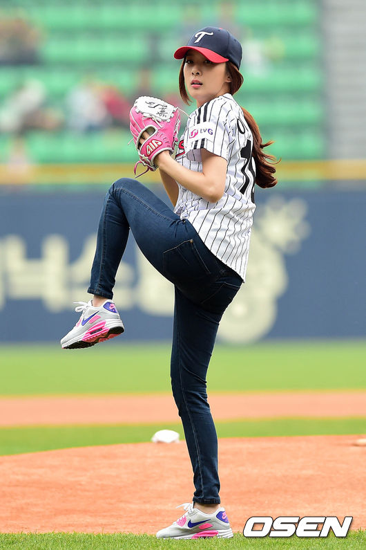 12일 오후 서울 잠실구장에서 열린 '2014 한국야쿠르트 세븐 프로야구' LG 트윈스와 NC 다이노스의 경기 시작전 이청아가 시구를 하고 있다.