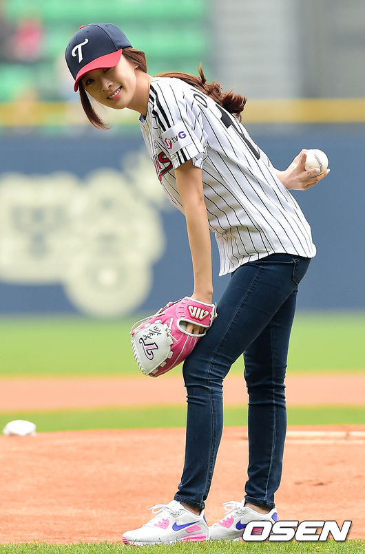 12일 오후 서울 잠실구장에서 열린 '2014 한국야쿠르트 세븐 프로야구' LG 트윈스와 NC 다이노스의 경기 시작전 이청아가 시구를 하고 있다.