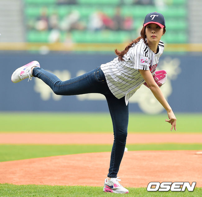 12일 오후 서울 잠실구장에서 열린 '2014 한국야쿠르트 세븐 프로야구' LG 트윈스와 NC 다이노스의 경기 시작전 이청아가 시구를 하고 있다.