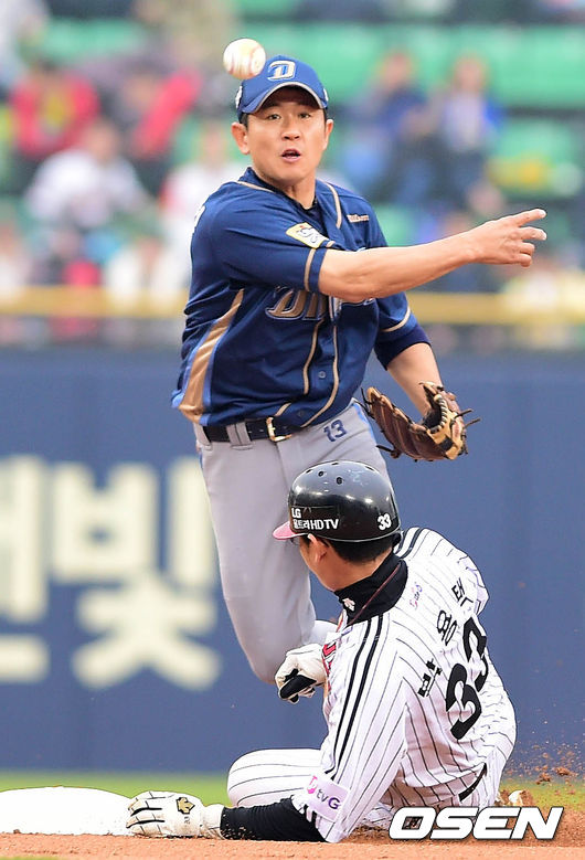 12일 오후 서울 잠실구장에서 열린 '2014 한국야쿠르트 세븐 프로야구' LG 트윈스와 NC 다이노스의 경기 1회말 1사 1루 정성훈의 병살타를 손시헌이 2루에서 박용택을 포스아웃 시킨 후 1루로 송구하고 있다.