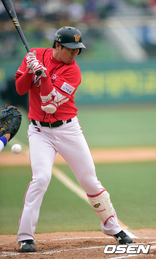 12일 오후 대구구장에서 열린 '2014 한국야쿠르트 세븐 프로야구' 삼성 라이온스와 SK 와이번스의 경기, 1회초 1사 3루 SK 최정이 삼성 선발투수 백정현의 투구에 맞고 있다.