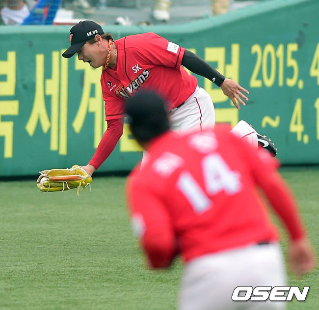 12일 오후 대구구장에서 열린 '2014 한국야쿠르트 세븐 프로야구' 삼성 라이온스와 SK 와이번스의 경기, 2회말 1사 1루 SK 박재상 좌익수가 삼성 이승엽의 파울타구를 잡아내고 있다.
