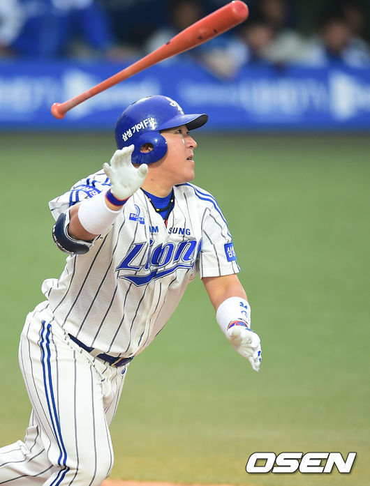 12일 오후 대구구장에서 열린 '2014 한국야쿠르트 세븐 프로야구' 삼성 라이온스와 SK 와이번스의 경기, 4회말 무사 1루 삼성 최형우가 역전 2점 홈런을 날리고 있다.