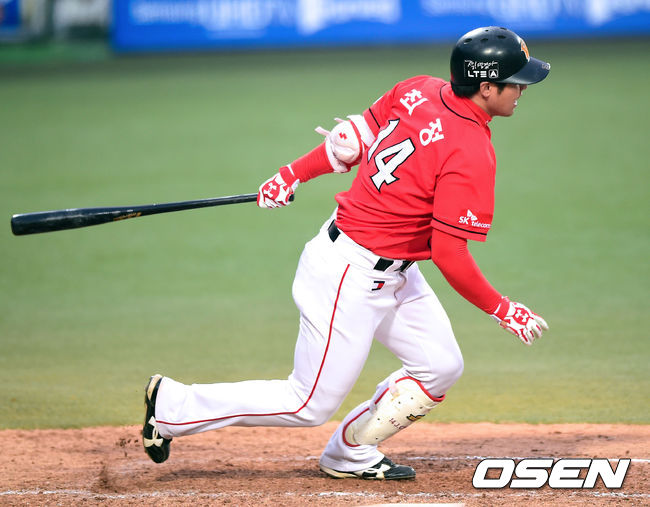 12일 오후 대구구장에서 열린 '2014 한국야쿠르트 세븐 프로야구' 삼성 라이온스와 SK 와이번스의 경기, 5회초 무사 만루 SK 최정이 역전 1타점 적시타를 날리고 있다.