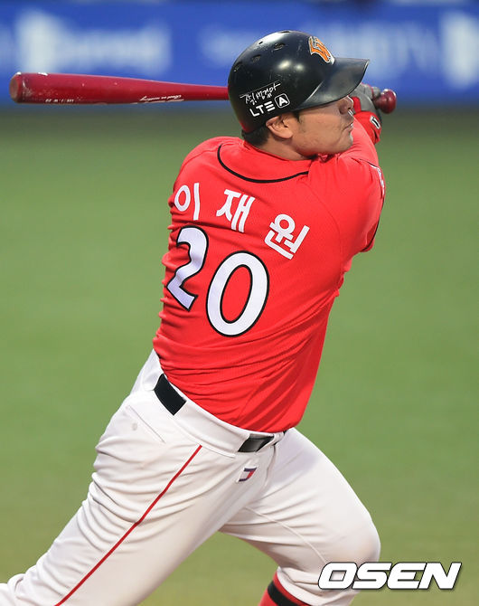 12일 오후 대구구장에서 열린 '2014 한국야쿠르트 세븐 프로야구' 삼성 라이온스와 SK 와이번스의 경기, 5회초 1사 만루 SK 이재원이 3타점 적시타를 날리고 있다. 이재원은 스캇의 부상으로 대신 선발출장했다.