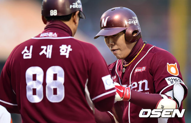 5회초 1사 1,3루에서 넥센 강정호가 좌전 적시타를 치고 심재학 코치와 하이파이브를 하고 있다.
