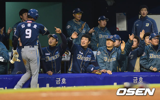 12일 오후 서울 잠실구장에서 열린 '2014 한국야쿠르트 세븐 프로야구' LG 트윈스와 NC 다이노스의 경기 7회초 1사 2,3루 이호준의 2타점 적시타에 2루주자 김종호가 득점하고 동료들과 하이파이브를 하고 있다.