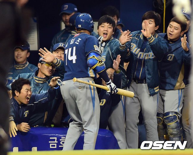 12일 오후 서울 잠실구장에서 열린 '2014 한국야쿠르트 세븐 프로야구' LG 트윈스와 NC 다이노스의 경기 7회초 2사 테임즈가 솔로포를 치고 덕아웃에서 동료들의 축하를 받고 있다.