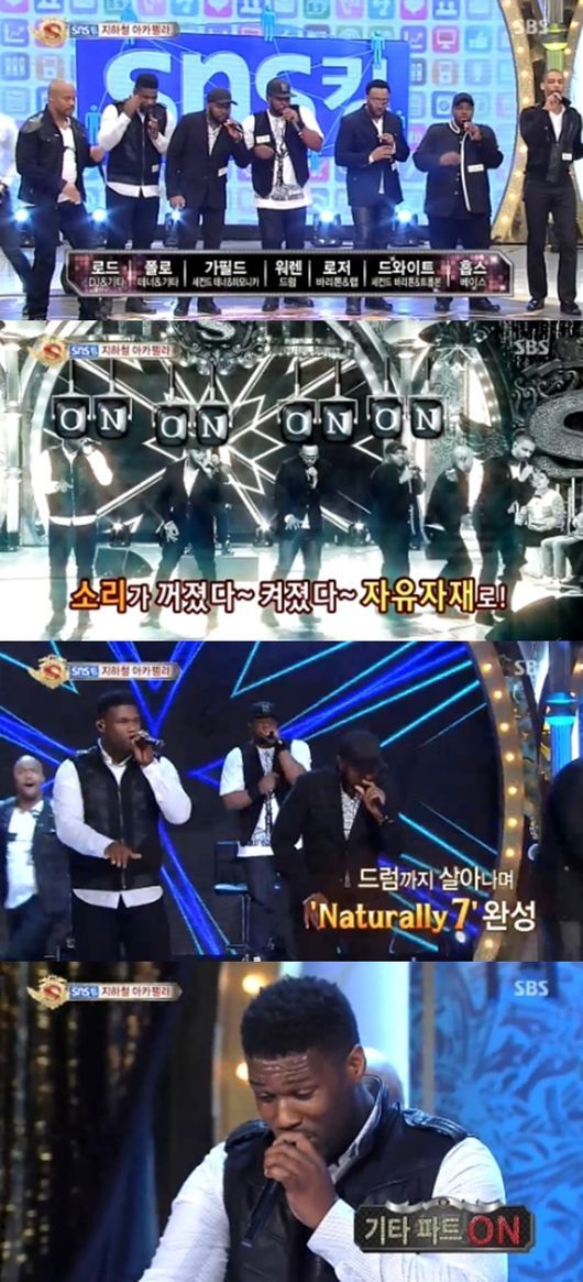 내추럴리7은 12일 방송된 SBS 예능 프로그램 '스타킹'에 출연해 목소리만으로 드럼, 베이스, 트럼펫, 트롬본, 기타, 하모니카 소리를 내며 놀라운 무대를 만들었다. 무대가 끝나자 '스타킹' 패널들은 동시에 기립해 박수를 보내고, 엄지손가락을 들어보였다.