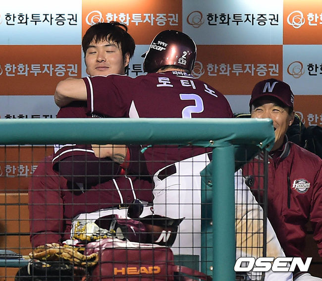 6회초 무사에서 넥센 로티노가 좌월 솔로 홈런을 치고 더그아웃에서 박병호와 기쁨을 나누고 있다.
