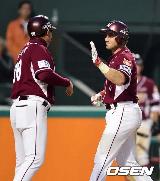 6회초 무사에서 넥센 로티노가 좌월 솔로 홈런을 치고 홈에서 심재학 코치와 하이파이브를 하고 있다.