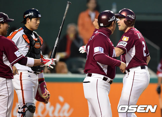 6회초 무사에서 넥센 로티노가 좌월 솔로 홈런을 치고 홈에서 심재학 코치와 하이파이브를 하고 있다.