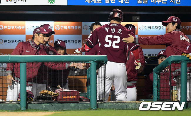 7회초 1사에서 넥센 박병호가 좌월 솔로 홈런을 치고 더그아웃에서 염경엽 감독과 하이파이브를 하고 있다.