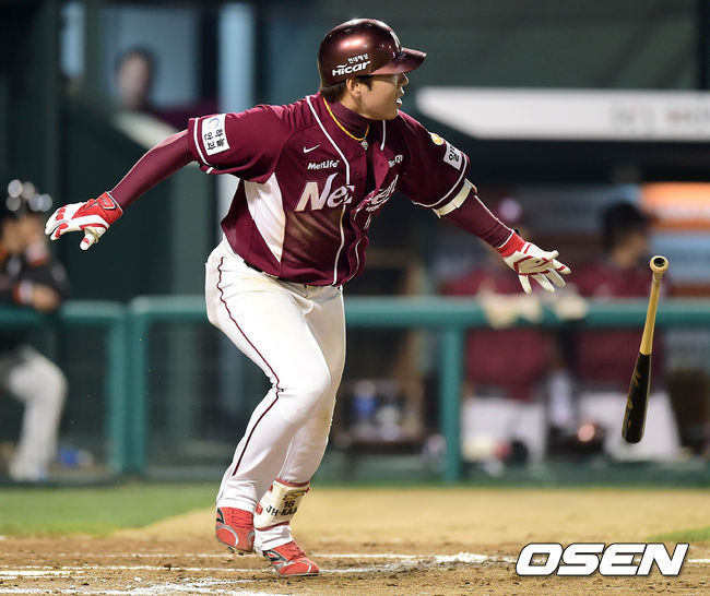 7회초 1사에서 넥센 강정호가 좌전 2루타를 치고 있다.