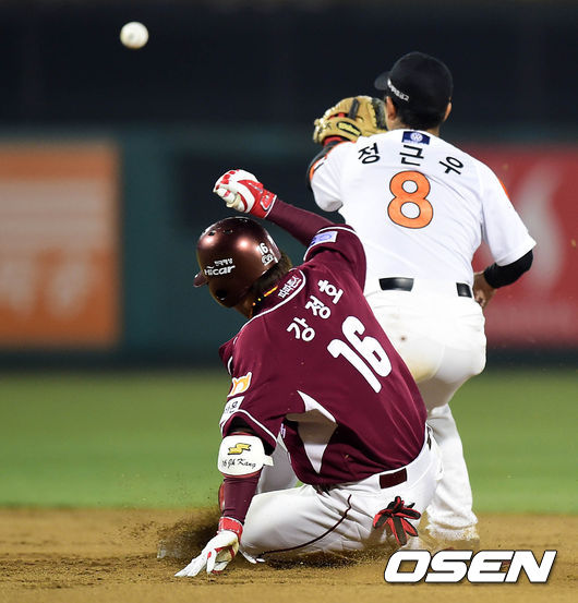 7회초 1사에서 넥센 강정호가 좌전 2루타를 치고 2루에서 세이프되고 있다.