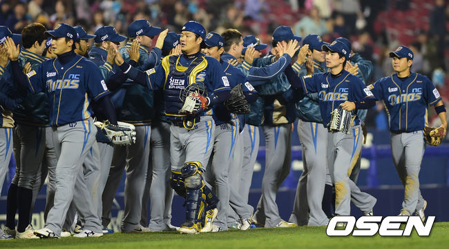 12일 오후 서울 잠실구장에서 열린 '2014 한국야쿠르트 세븐 프로야구' LG 트윈스와 NC 다이노스의 경기 종료 후 NC 선수들이 하이파이브를 하고 있다.