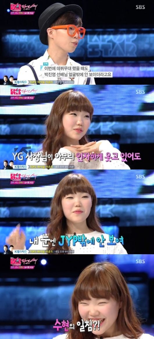 이수현은 "'K팝스타3'에서 데뷔 무대를 할 때 사장님이 계속 미소 지으시면서 응원해주고 계신데, 입술 반짝반짝하는 박진영 심사위원만 눈에 들어왔다. 아직도 무섭다"고 설명했다.