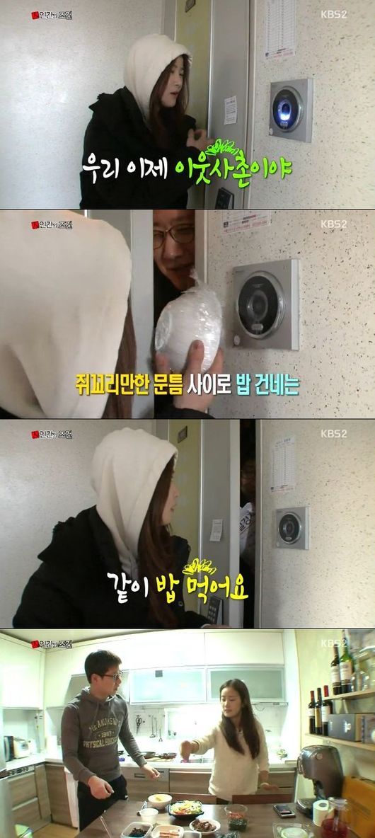 이날 김지민은 "윗집에 조우종씨가 산다"며 다짜고짜 윗집에 올라가 밥을 얻었다. 조우종은 "새벽 근무를 하고 와서 피곤하다"며 문 틈으로 밥만 가까스로 건넸다.