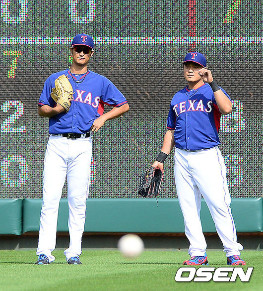 경기에 앞서 다르빗슈와 추신수가 외야에서 훈련도중 이야기를 나누고 있다.