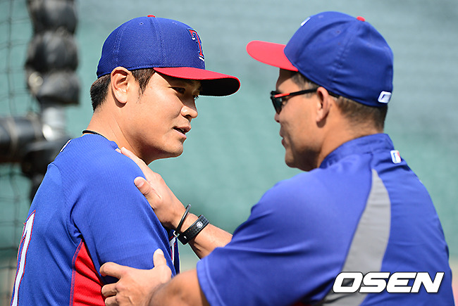 경기에 앞서 텍사스 추신수가 이반 로드리게스와 이야기를 나누고 있다.
