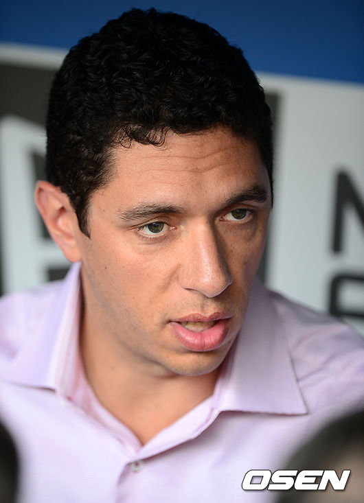 경기에 앞서 텍사스 존 대니얼스 단장이 취재진과 이야기를 나누고 있다.