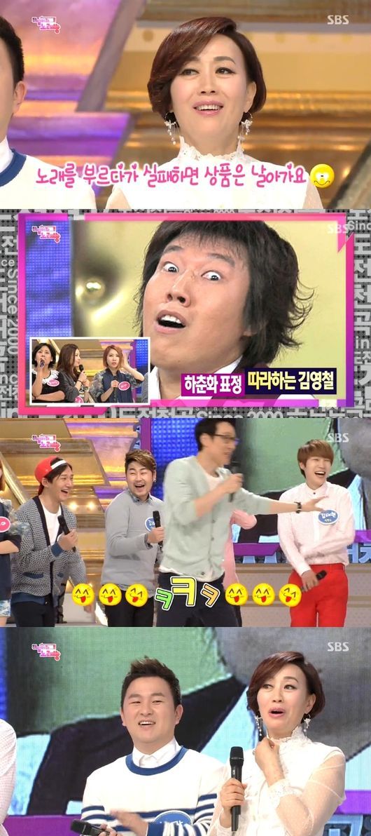 13일 오전 방송된 SBS 예능프로그램 ‘도전천곡’ 중 ‘뒤집어라 노래방’ 코너에서는 사진을 보고 노래 제목을 맞추는 퀴즈가 진행됐다. 여기서 하춘화는 개그맨 김영철의 사진을 보고 본인 성대모사를 했다.