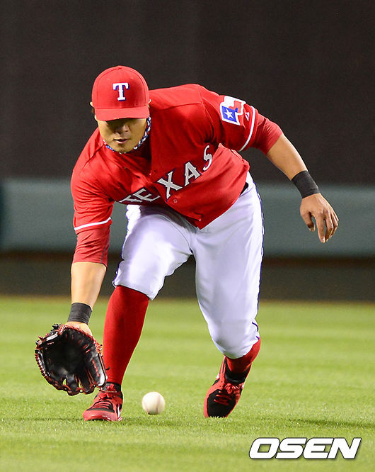 4회초 무사 1,2루에서 텍사스 추신수가 휴스턴 카터의 1타점 적시타 타구를 잡고 있다.